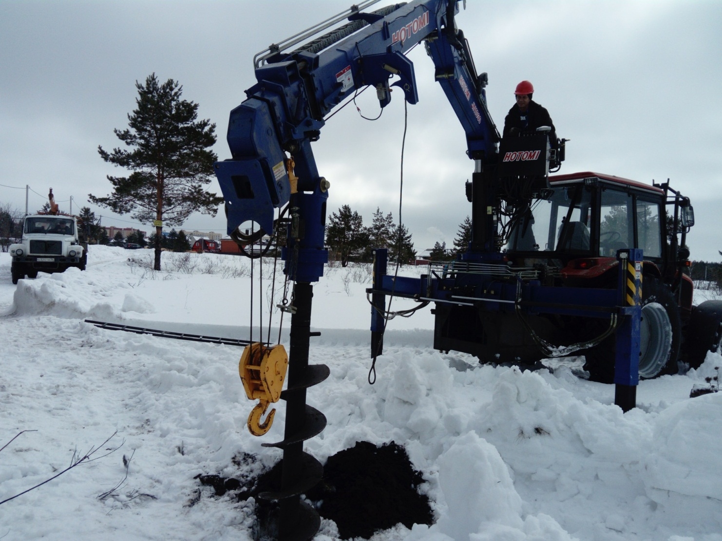 Трактор-экскаватор в зимнее время года осуществляет уборку снега, подготавливает грунт к бурению котлованов для установки ж/б опор.